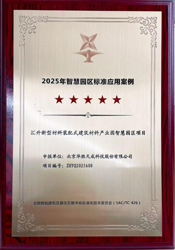 近日,由全国智能建筑及居住区数字化标准化技术委员会智慧园区标准工作组(SAC/TC426/WG5)主办的“智慧园区标准应用案例”评选结果正式公布。华胜天成规划、建设并交付的“汇升新型材料装配式建筑材料产业园智慧园区”项目,凭借其领先的平台架构、丰富的场景应用与显著的运营价值,荣获年度最高荣誉——五星级智慧园区应用项目。标志着该项目在智能化建设、运营价值及行业示范性方面获得国家级标准认可。