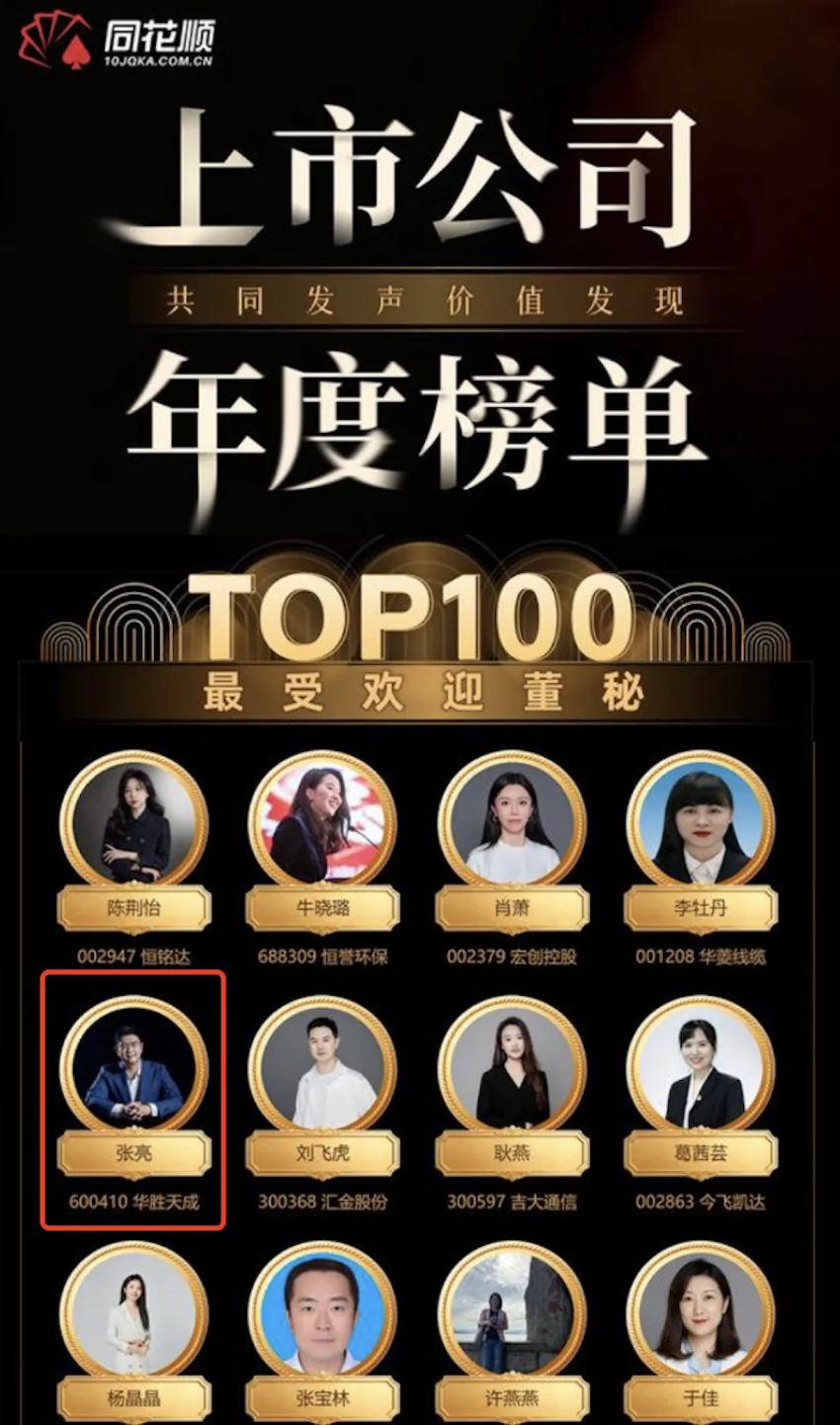 近日,2025同花顺上市公司年度榜单正式揭晓。华胜天成凭借卓越的综合实力和投资者关系管理能力,成功入选“最具人气上市公司TOP100”榜单。同时,华胜天成董秘张亮以突出的专业素养与优质服务荣获“最受欢迎董秘TOP100”称号。