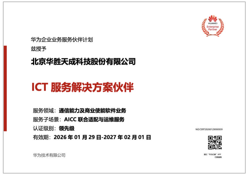 基于在智能客服领域的持续深耕能力,华为授予华胜天成华为AICC领先级ICT服务解决方案伙伴身份,体现了华为对华胜天成协同创新能力与方案落地成效的高度认可。未来,华胜天成将继续与华为深化协同,坚持战略同心、能力共建、价值共创,推动联合创新成果在更多行业场景中落地应用,携手迈向智能未来。